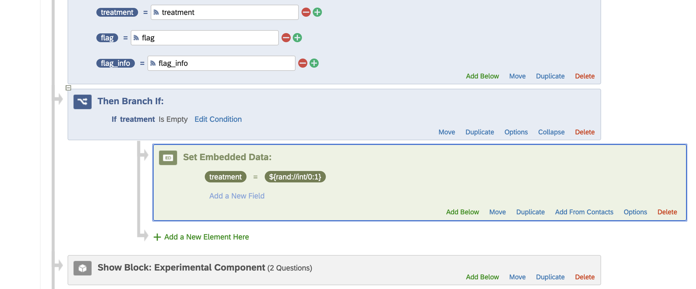 that is triggered if the treatment field is empty. Then, inside the branch, add an Embedded Data component,